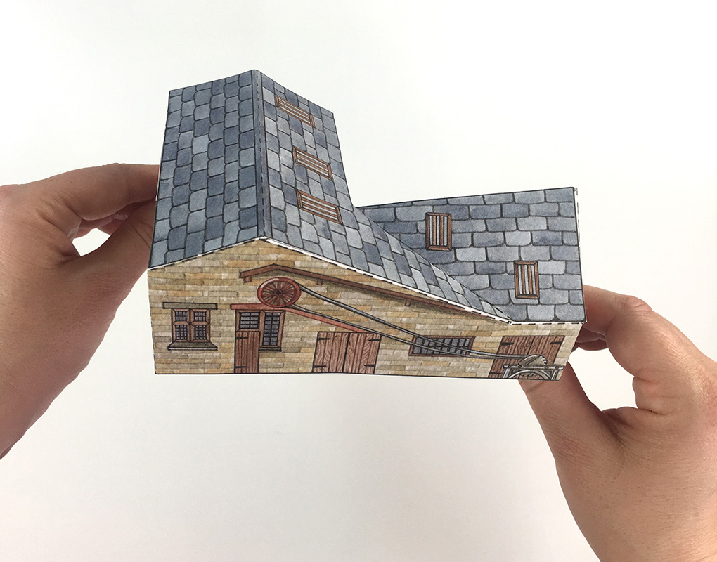 Fold B3 in half and glue to the tabs at the top of the walls to complete the boiler house.