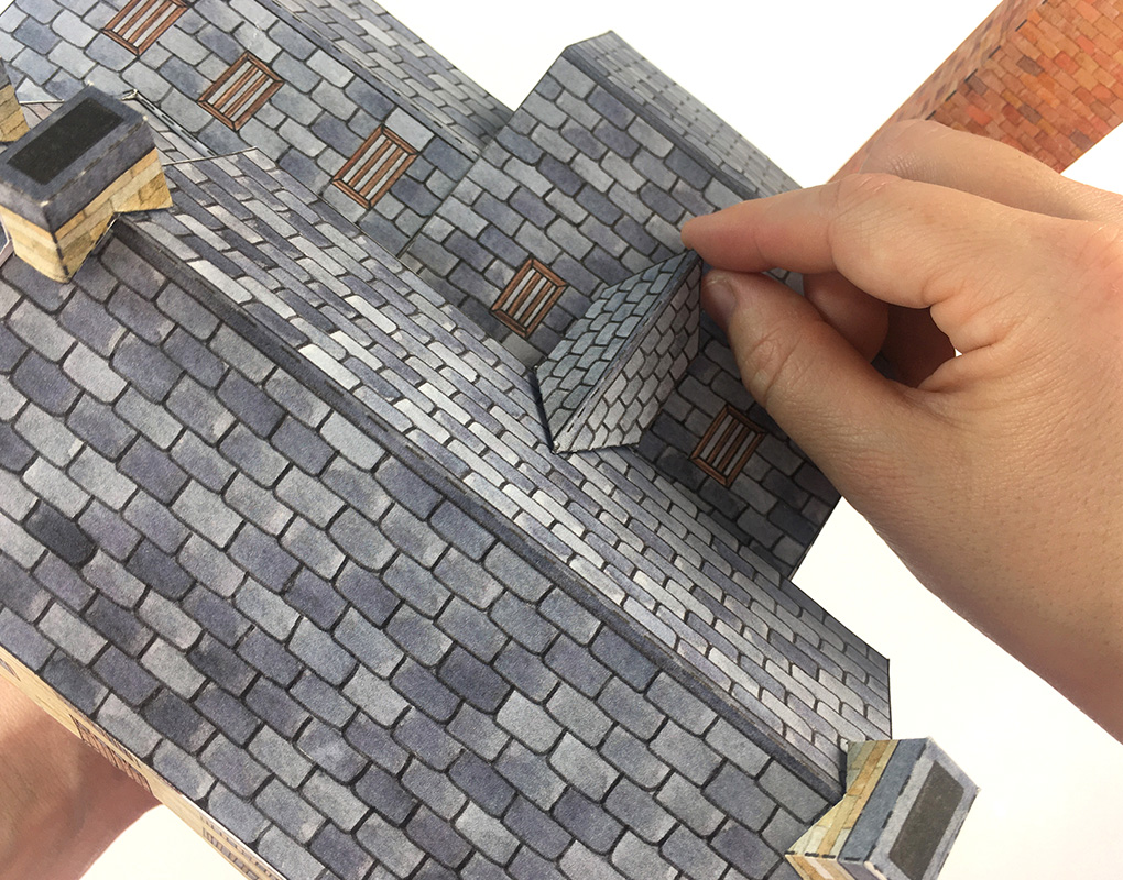 Fold the roof of the old mill, A3, along the dotted line, and glue to the tabs at the top of the building to secure. Tuck it under the small triangle tabs at the bottom of the chimneys, putting a small blob of glue on these tabs if needed.