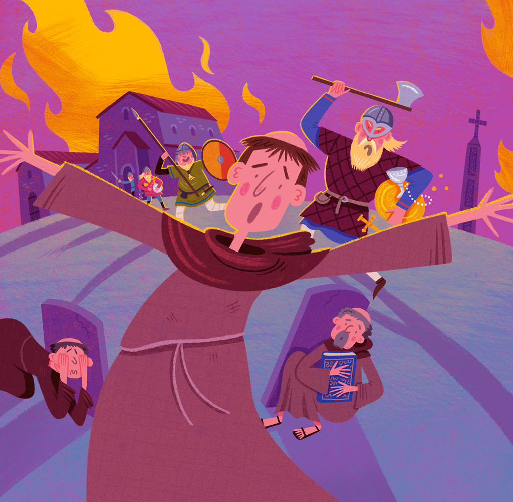 The monks of Lindisfarne Priory are killed by raiding Vikings from Scandinavia.