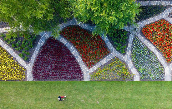 Unusual varieties of fruit and vegetables are displayed in the garden in eye-catching patterns that change depending on the season. Beautifully trained fruit trees, mostly comprising traditional Kentish varieties, surround the planting beds, and an area of orchard contains three apple trees donated by the Worshipful Company of Fruiterers – one of which was planted by the Queen Mother.