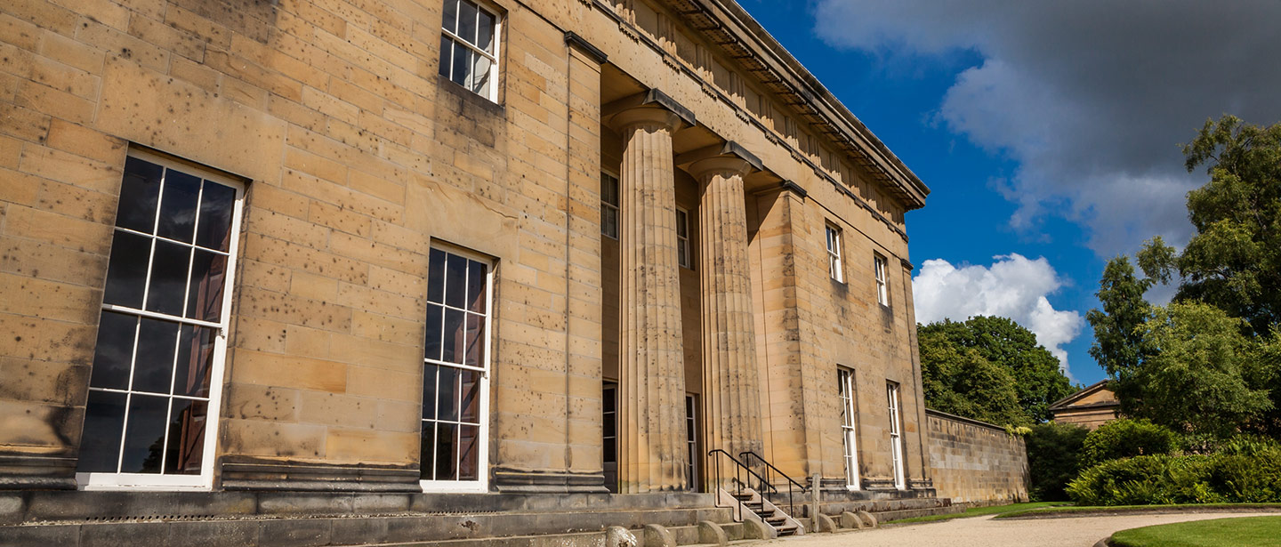 Work began in the summer of 1807, a year after Sir Charles and his wife returned from honeymoon. He drew inspiration from the ancient sites he had seen in Greece, and from books of Greek architecture in his library, producing a design of uncompromising austerity. The house, built of beautifully dressed sandstone blocks, is exactly 100 feet (30 metres) square and like a Greek temple sits on a crepidoma, or stepped plinth. The two massive Doric columns supporting the inset portico are copied from an ancient temple in Athens – the Theseion.