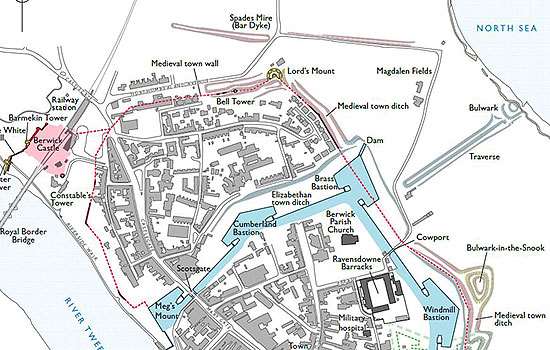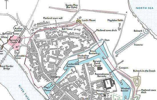 Situated at the mouth of the River Tweed near the border of two kingdoms, the town of Berwick suffered centuries of conflict, as control of the town passed back and forward between England and Scotland until the late 17th century. Each crisis brought repairs and improvements to the fortifications, culminating in the great artillery ramparts begun in 1558. These survive largely intact and make Berwick one of the most important fortified towns of Europe.